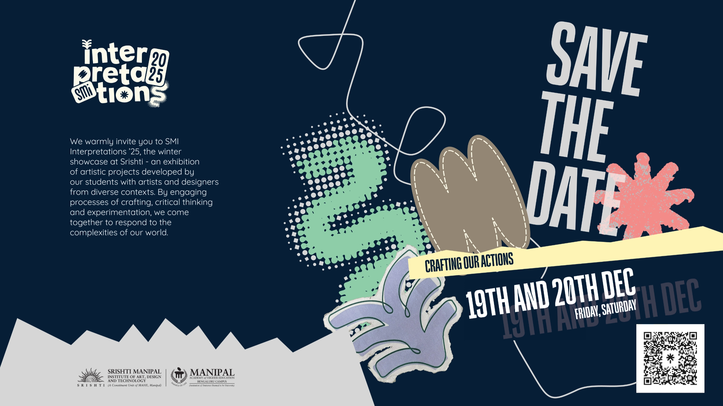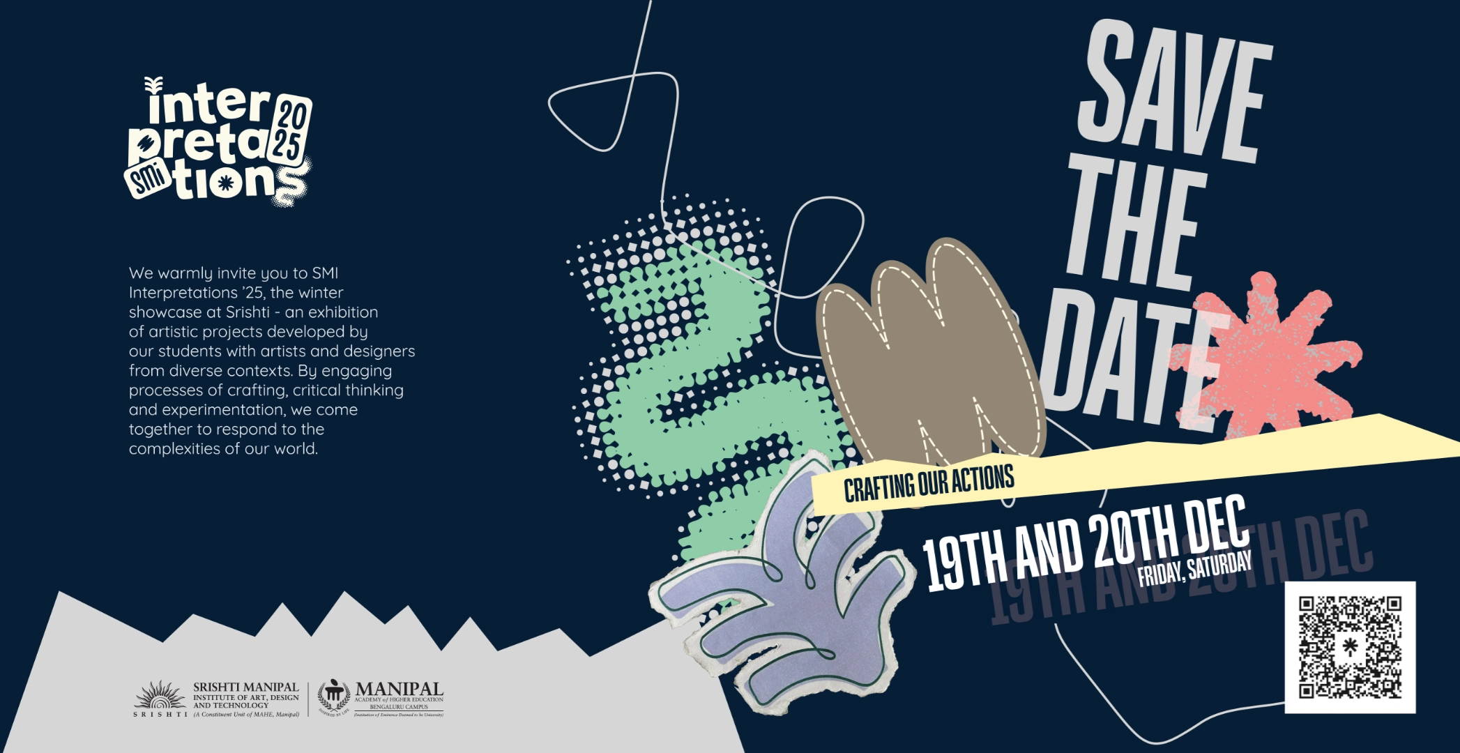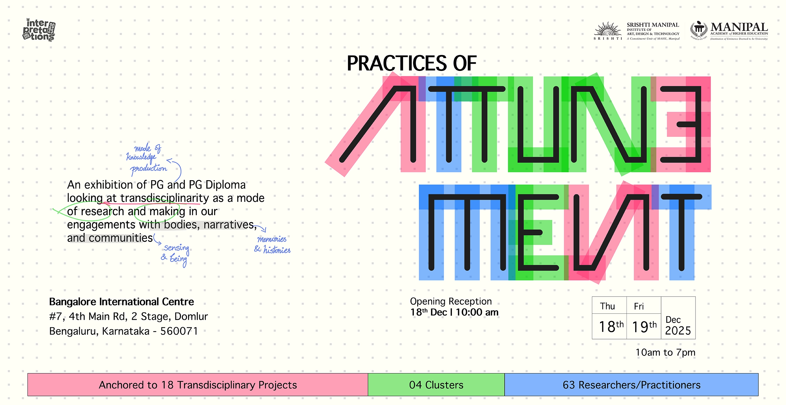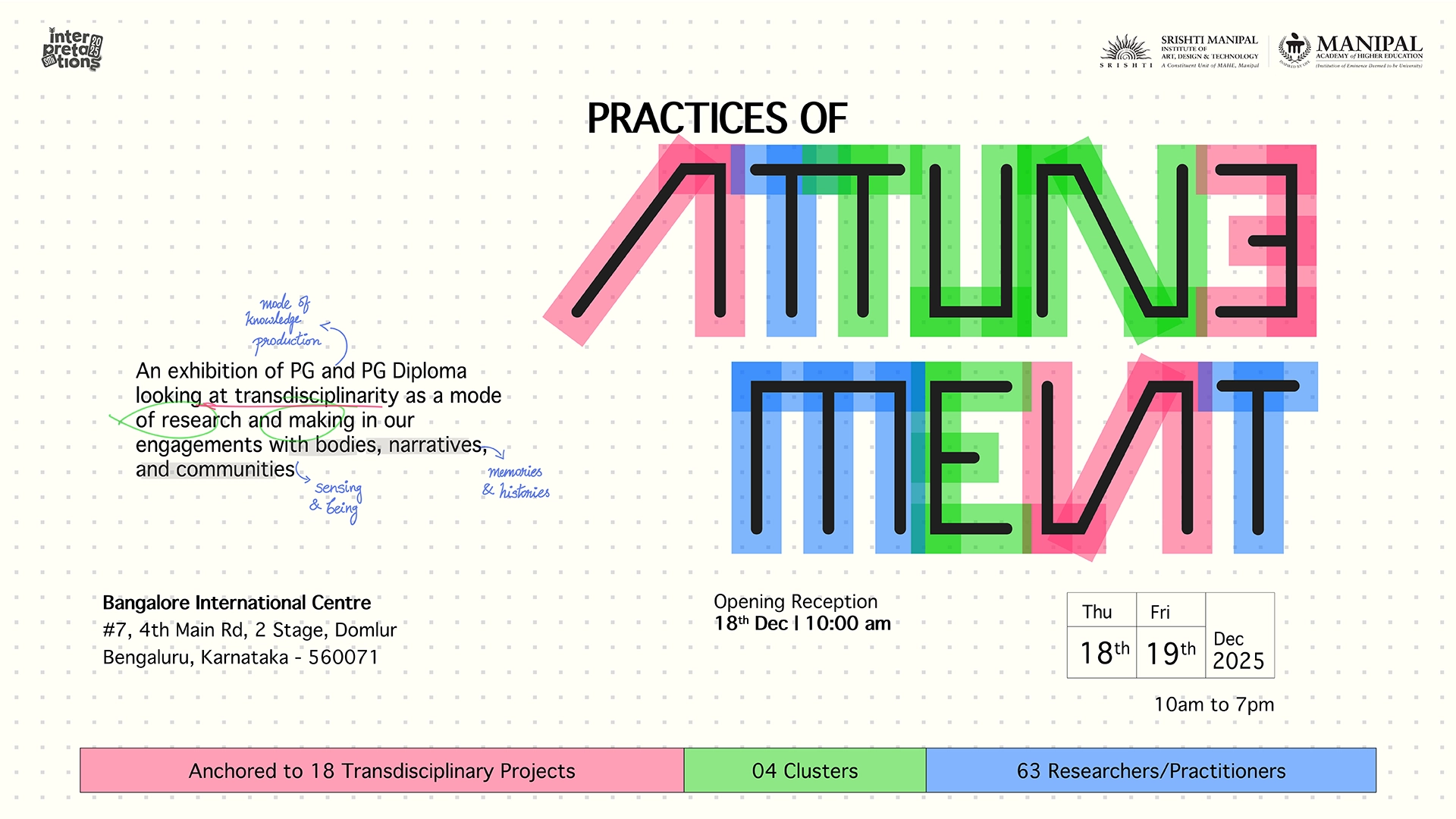 Srishti Manipal Institute of Art, Design and Technology (SMI)—formerly known as Srishti Institute of Art, Design and Technology—has pioneered transdisciplinary art and design pedagogy for nearly three decades. Srishti educates artists, designers and practitioners with an aim to inspire and encourage creativity. Integrating practice, performance, research and experimental pedagogy has enabled Srishti students always to remain ahead of the curve.