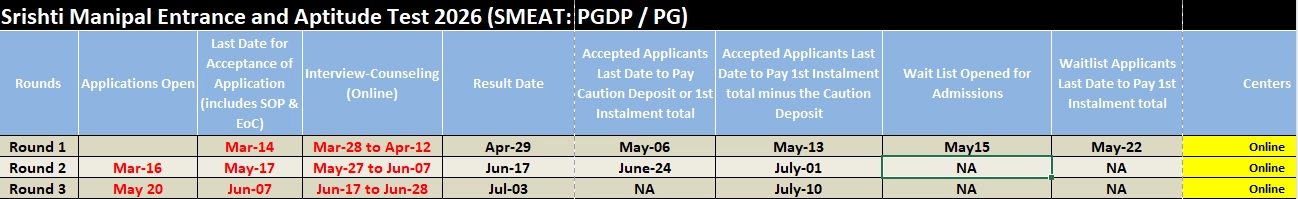 - All applicants should check the Srishti Manipal website for further information and updates regarding SMEAT 2025. This will be published at https://srishtimanipalinstitute.in/admissions