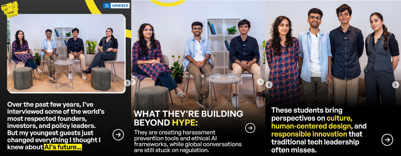 Navneet Kaur, the founder of FemTech India and the host of the podcast Ctrl Alt Thrive (UNESCO) had this to say about the conversation she had with Anuhya, Aditya and Pranav: